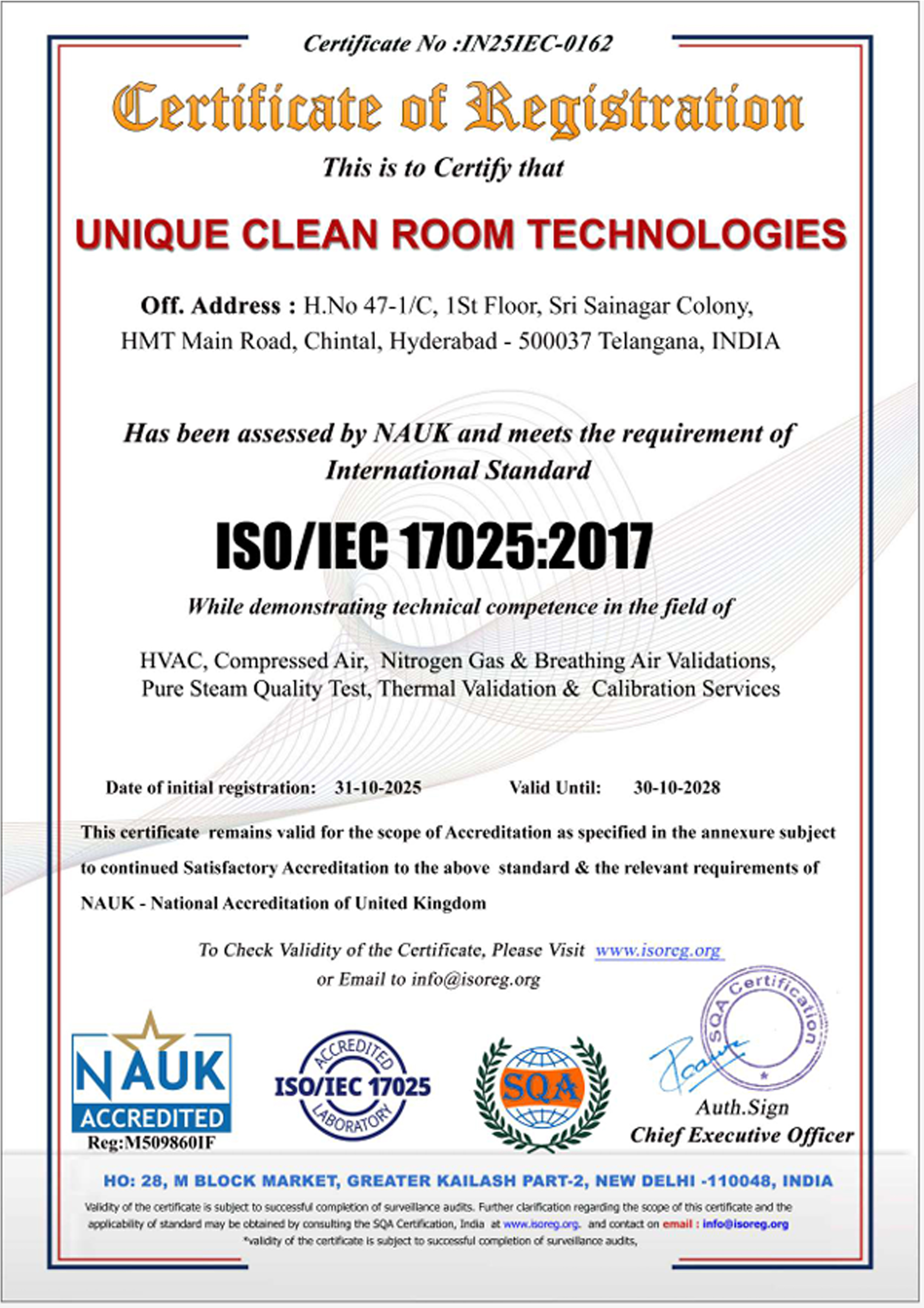 Unique Cleanroom Technologies provides validation services to Pharmaceutical, Food, Biotech and other Microelectronic industries regulated standards such as ISO-14644, ISO-8573, EU-GMP, WHO, USFDA. Unique Cleanroom Technologies is a Pan India Company with the most competitive focus in the field of Validation of Cleanroom / I-1VAC activities. Established in 2014, We have the capability to offer our customers localized support and services when and wherever required. We have been certified by ISO.